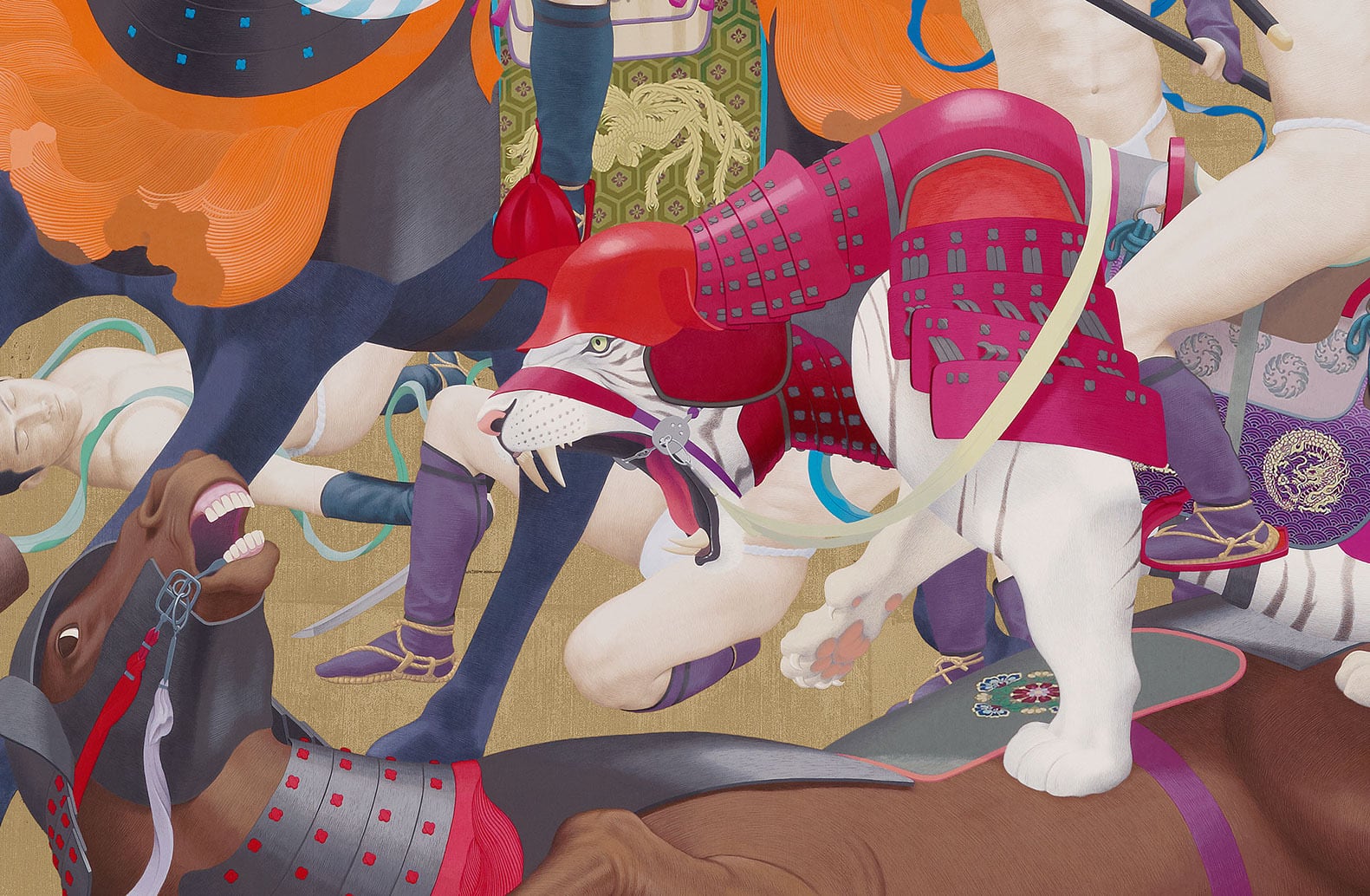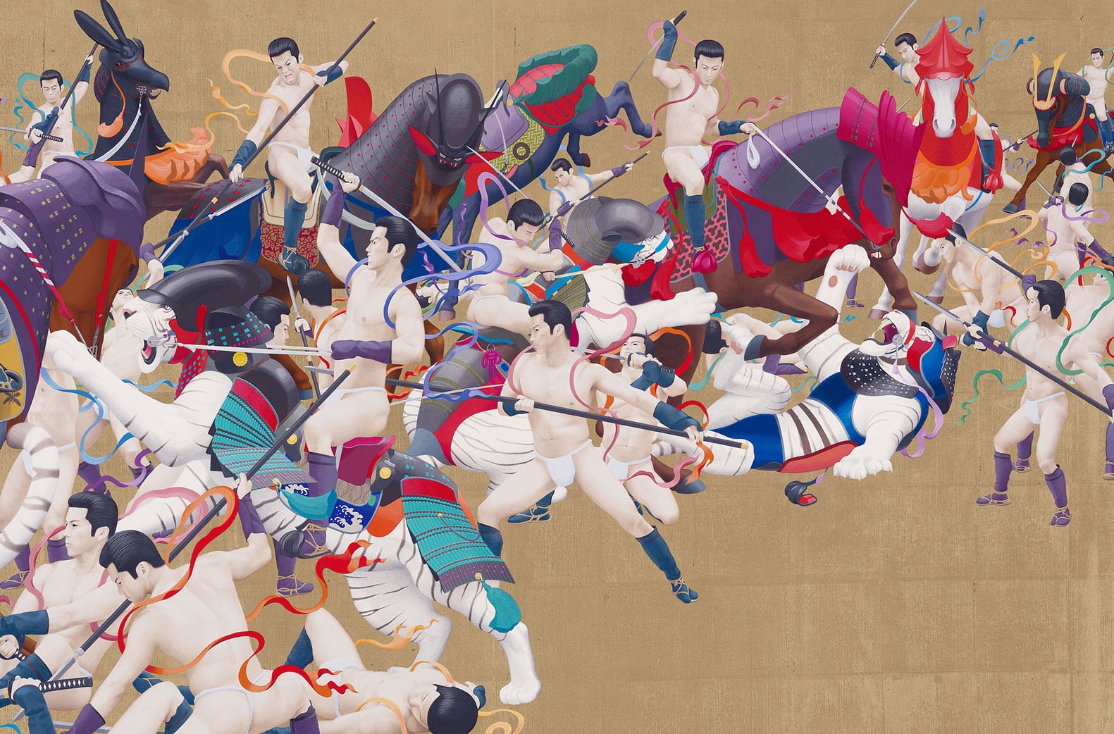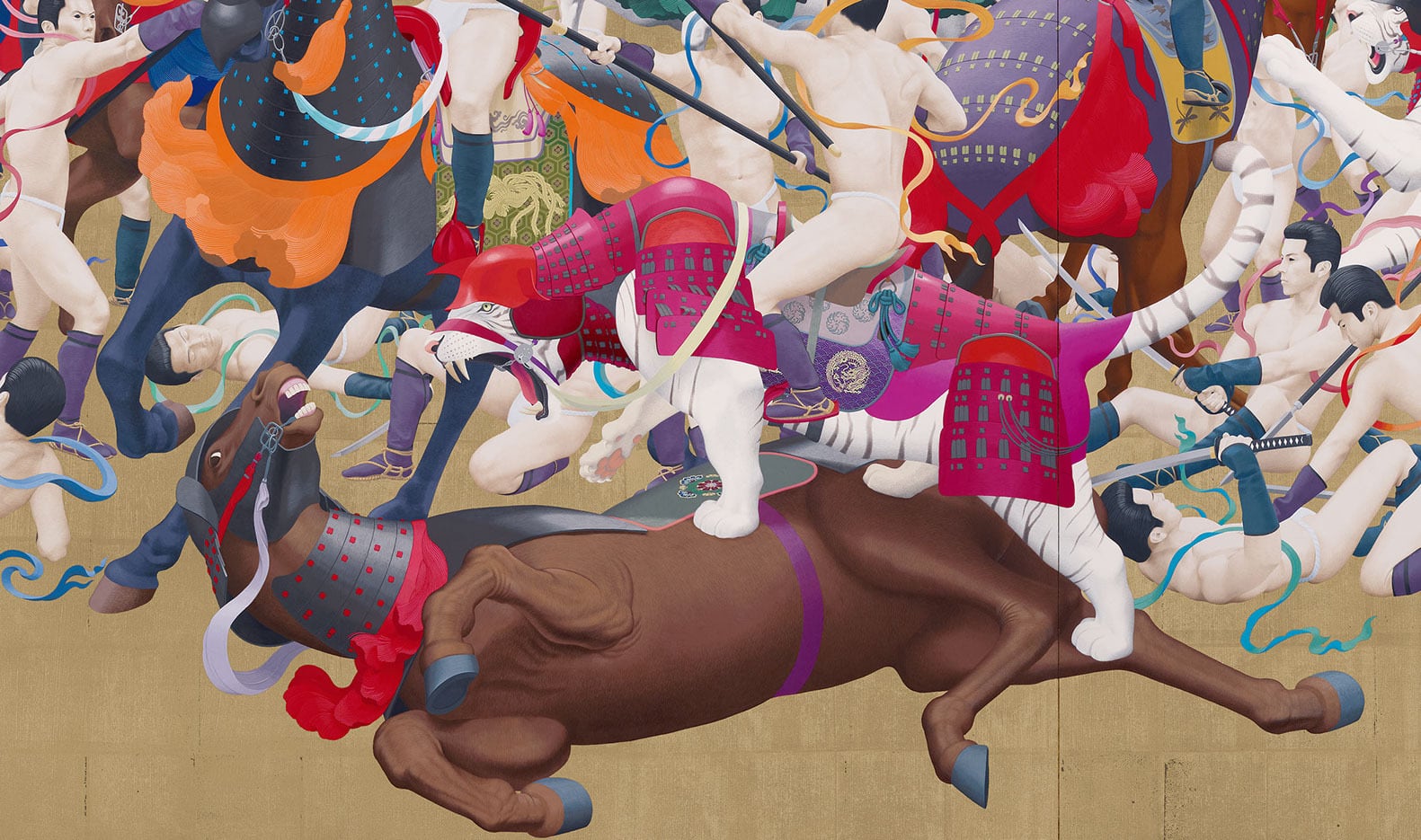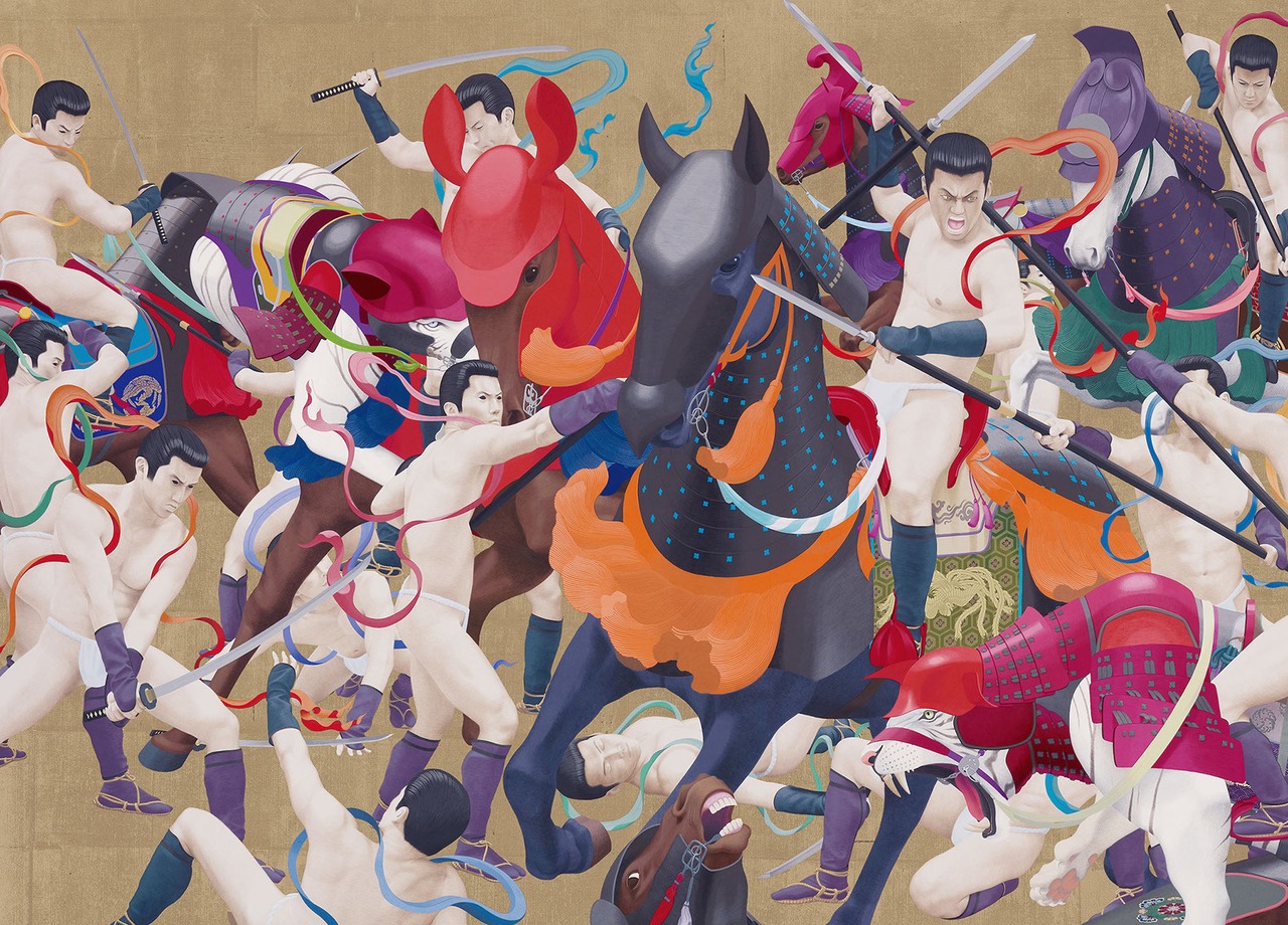 作品は二作一対で、左右反転したシンメトリー構図となっていますが、実は天明屋が自ら描いたのは左側のみで、右側の絵は高精度な印刷物に過ぎません。この仕掛けを個展開催時に見抜いた者は皆無でした。現代美術における「ホンモノ」と「ニセモノ」、本画と印刷物の関係を疑い、常識に揺さぶりをかける。ある意味では鑑賞者の審美眼を試すような、衝撃的な展示となりました。この逸話をふまえたとき、「韻」の版画に対する見方もまた違ってくるのではないでしょうか。