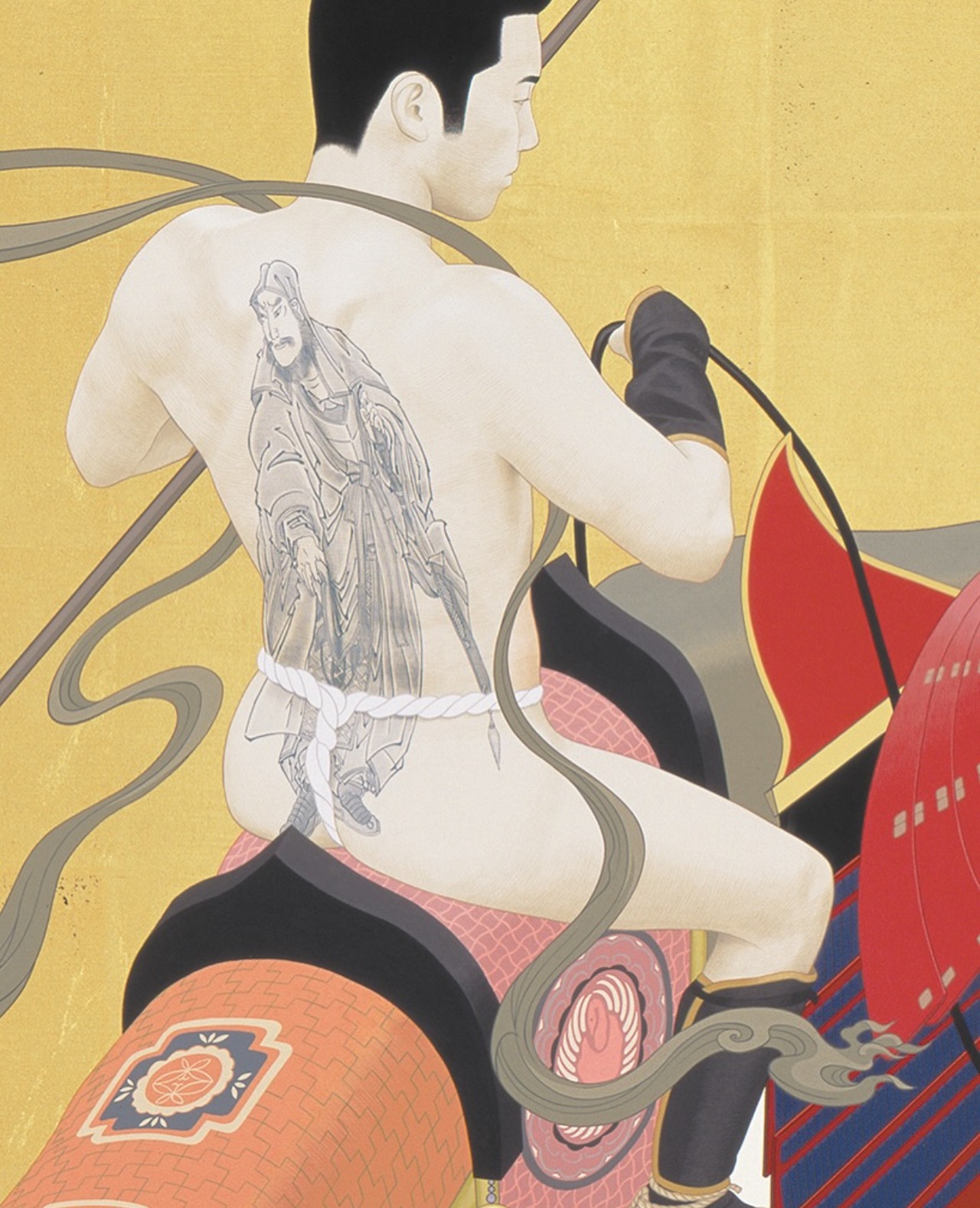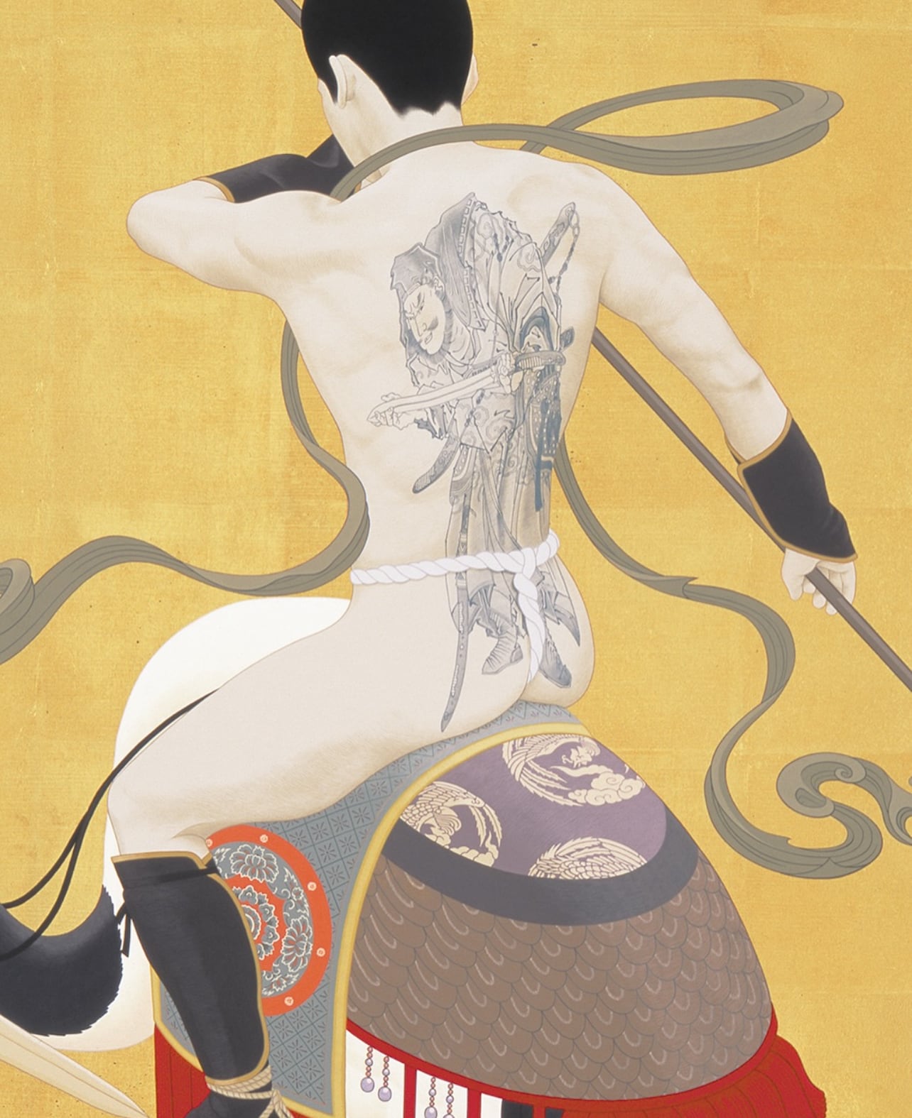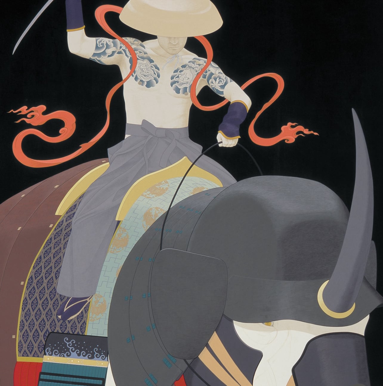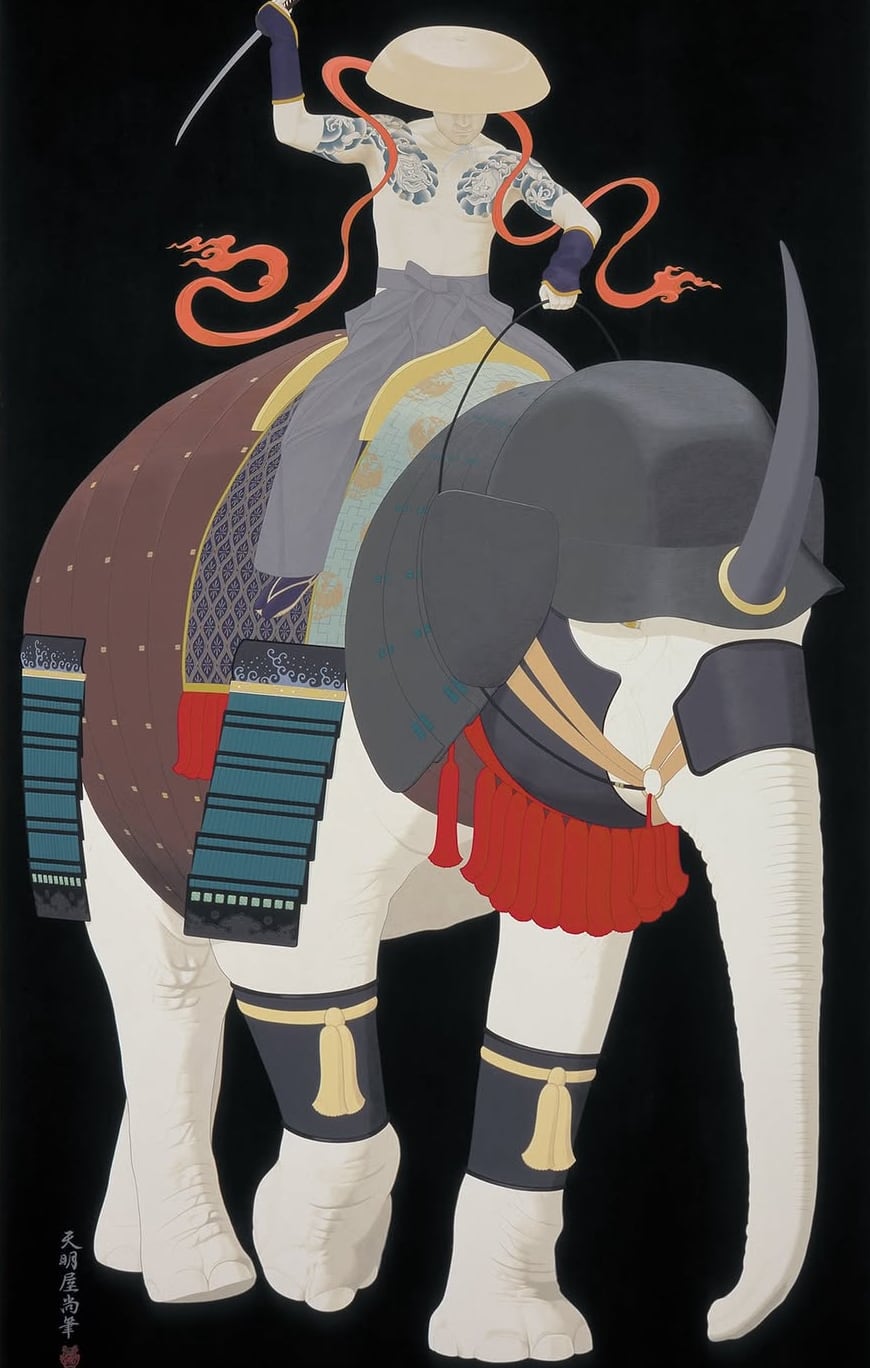 天明屋がくり返しモチーフとする変わり兜を身にまとった神獣を、三幅対形式仕立てにした作品の版画バージョンです。ヒマラヤのホワイトタイガーは神の使いとされ、タイの白象は王の権威の象徴、日本の白鶴は天女信仰と結びつく、いずれも霊験あらたかな神獣です。同時に展示された「闘魂」(2008年)とは対をなし、一触即発的な「闘魂」を「動」とするならば、こちらは闘いの前の凪の状態、「静」を表しています。シリーズ制作された3作品を一枚の版画として一枚仕立てにした特別仕様です。天明屋自身、「シリーズものは本来、単体で観るより、すべて合わせて観るものとして制作している」と語るように、シリーズものを一枚仕立ての版画とすることで本来の作家の意図を忠実に反映した趣向となっています。