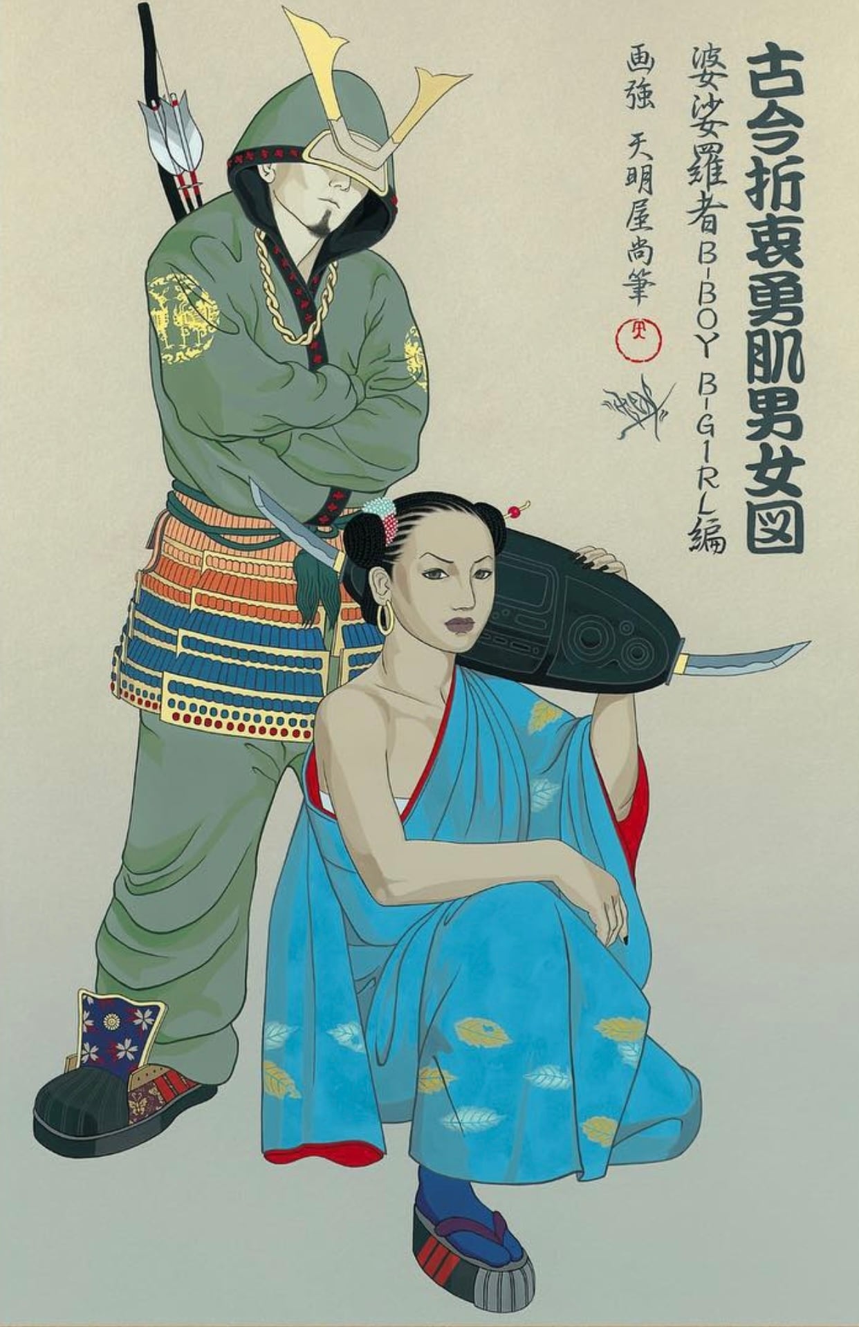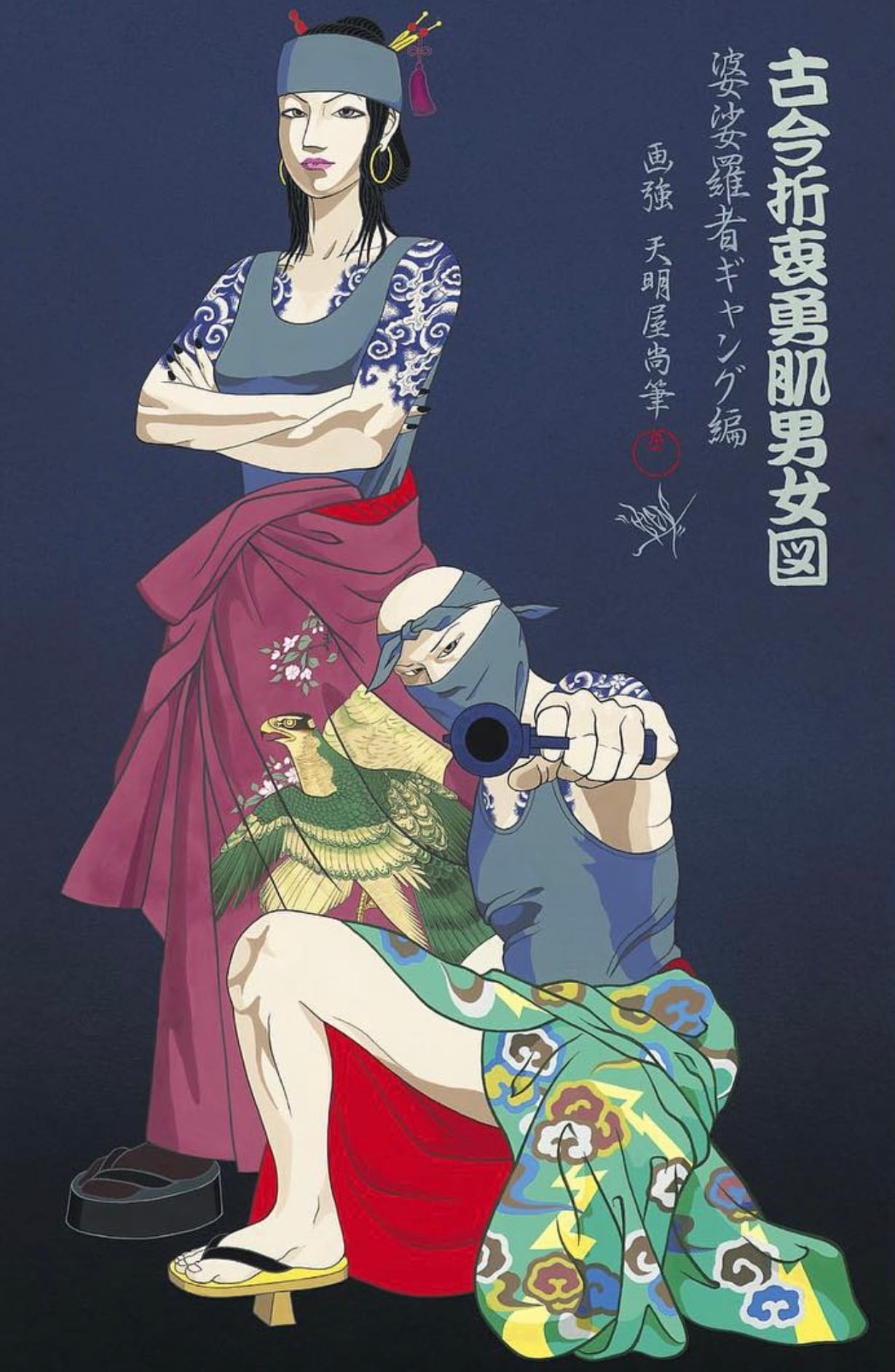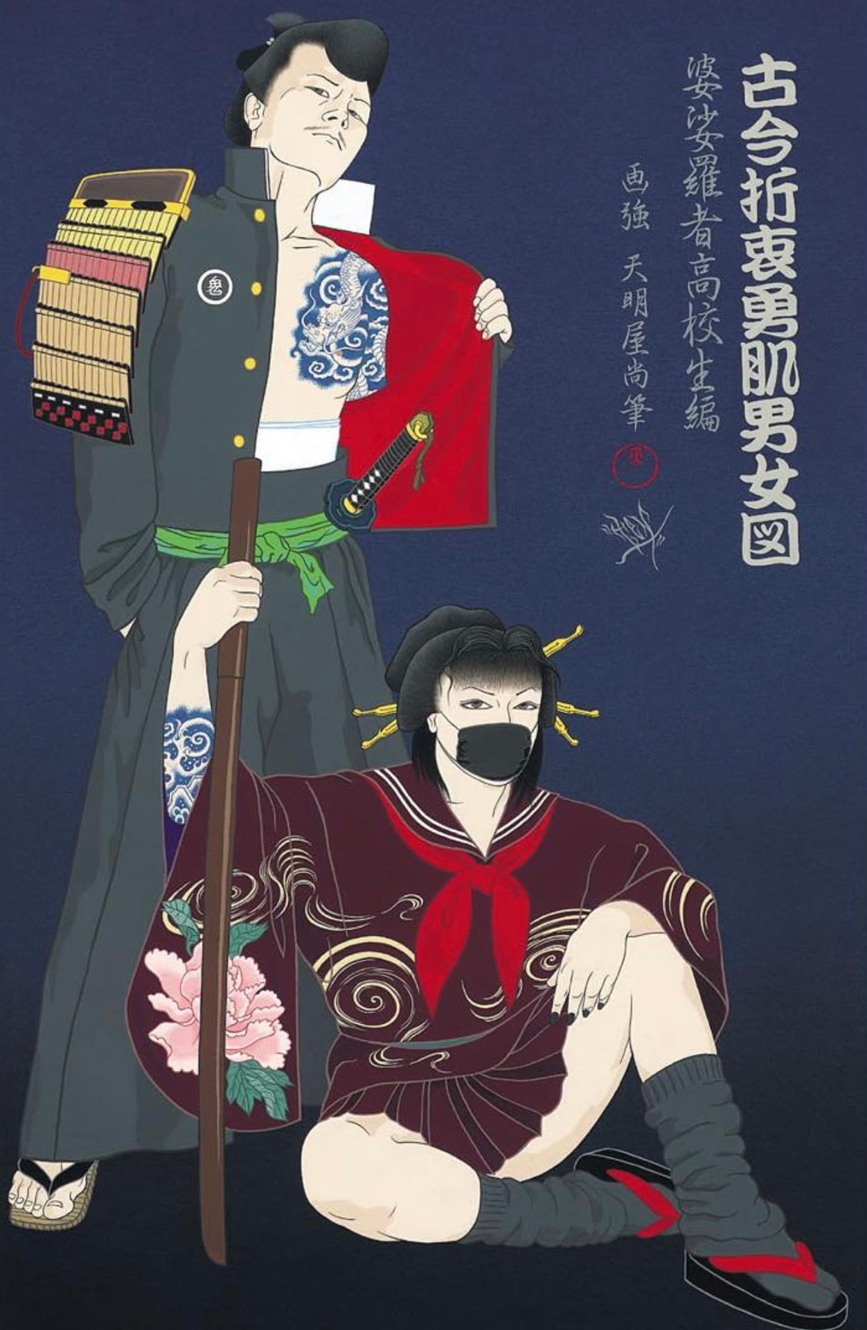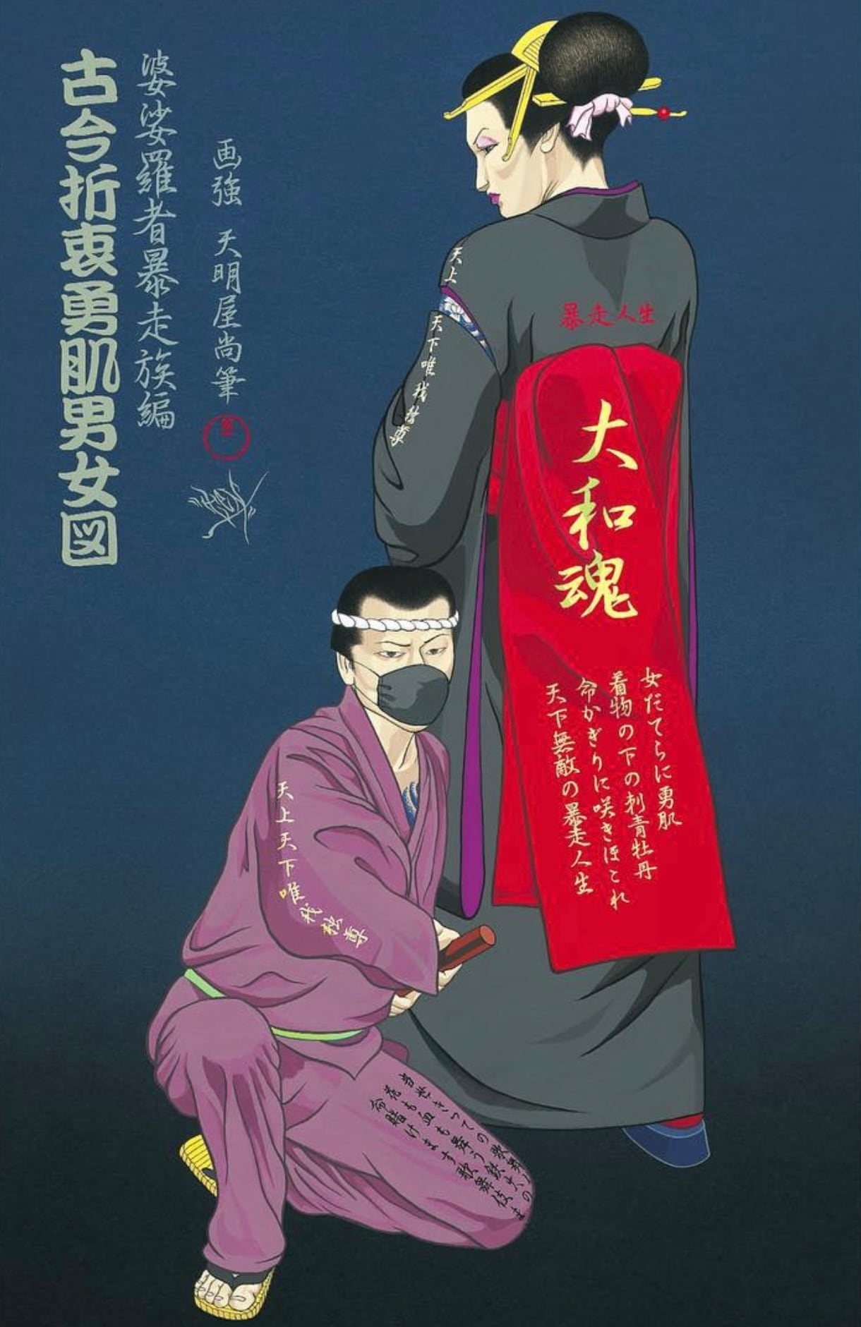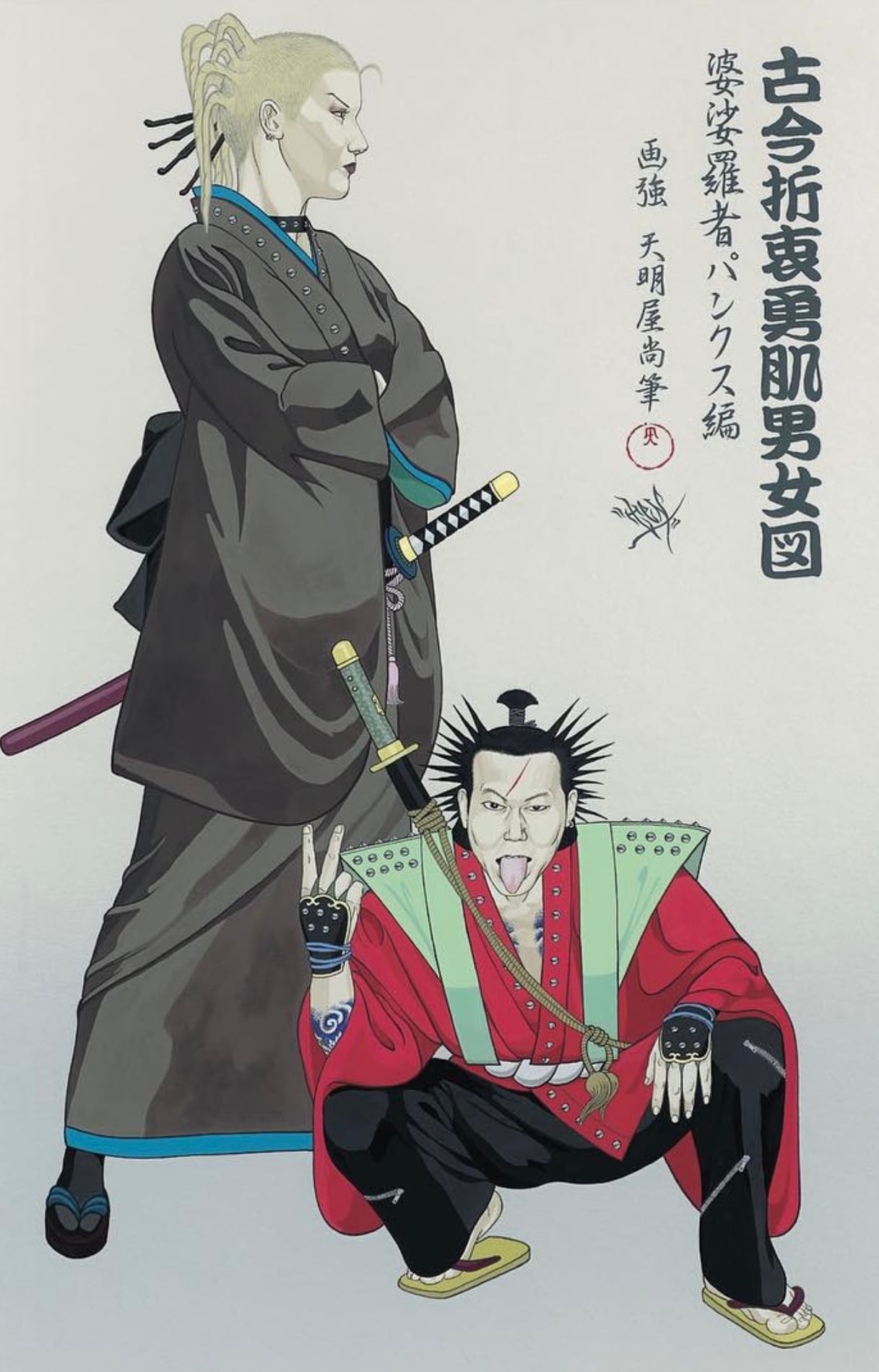 戦国時代の婆娑羅(バサラ)、江戸時代の傾奇者といった輩を現代のゾクやヤンキーに仮託して描く婆娑羅者シリーズです。日本美術を禅でもわび・さびでもない、婆娑羅者の視点から読み解くという姿勢は、現在の天明屋作品においても一貫しています。シリーズ制作された5作品を一枚の版画として一枚仕立てにした特別仕様です。天明屋自身、「シリーズものは本来、単体で観るより、すべて合わせて観るものとして制作している」と語るように、シリーズものを一枚仕立ての版画とすることで本来の作家の意図を忠実に反映した趣向となっています。